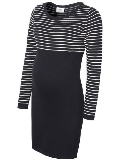 Mamalicious Silvia gravidklänning är en underbart mjuk stickad klänning för blivande mammor. En stilren vardagsklänning, där fräscha ränder möter en mörkblå underdel, passar både för arbete och fritid. Klänningen har ett avtagbart bälte så att du kan framhäva din växande mage, eller helt strunta i bältet. Färgen är mörkblå Blue Depths.