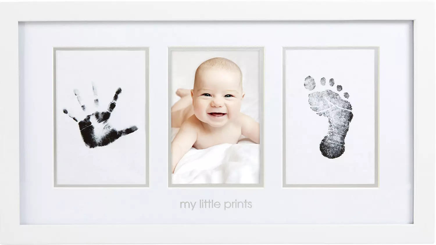 Pearhead Fotoram 3-delad Babyprints fotoram Vit. Skapa och spara ett underbart minne av ditt lilla barns hand- och fotavtryck i en vacker vit fotoram. Pearhead Clean-Touch handavtryck är ett enkelt och rent sätt att bevara fot- och handavtryck. Ingen smuts görs under tryckningen eftersom barnets hud inte rör bläcket.