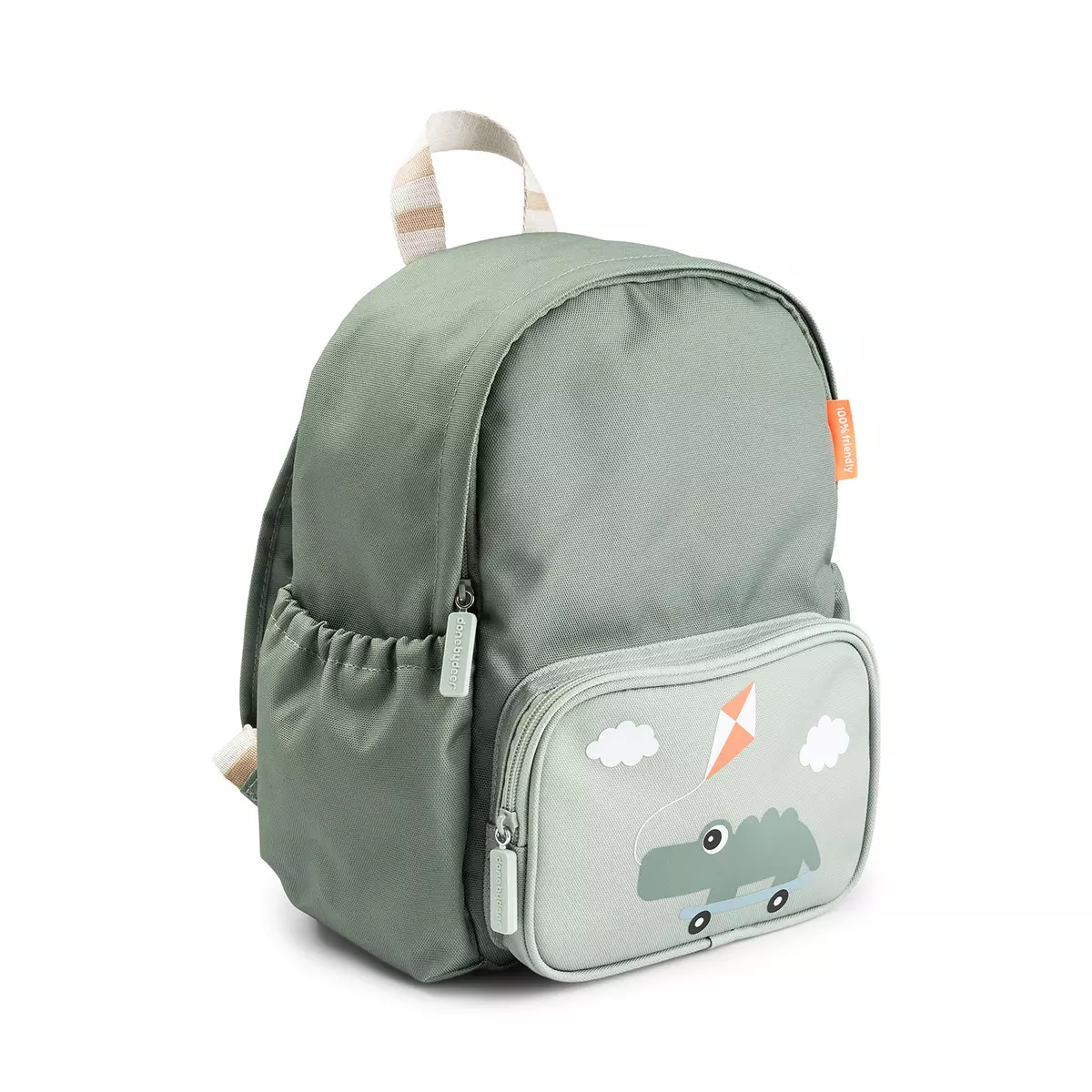 Ryggsäcken har en bild av en söt krokodil som flyger med en drake. Den har justerbara vadderade axelremmar och remmen kan fästas framtill med en separat klämma. Ryggsäcken sitter bra på ryggen, och axelremmarna rör sig inte ner för en liten barn när klämman är fäst.