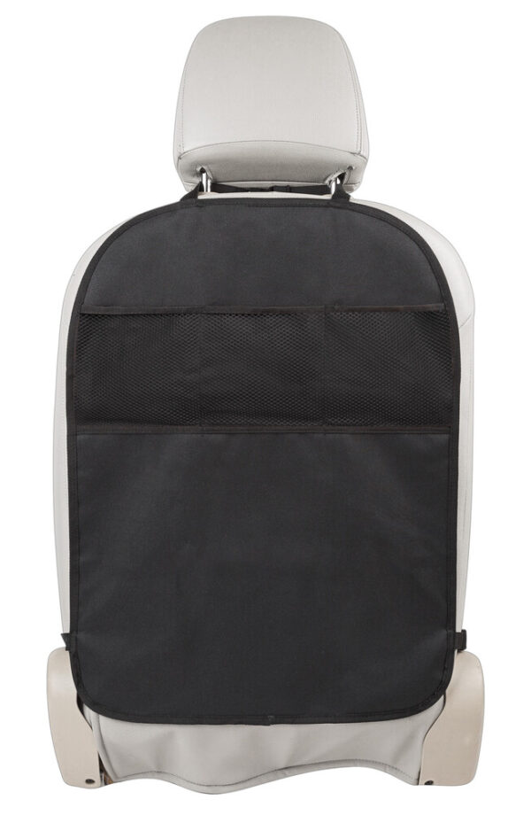 Bilskyddet Ezimoov Travel Classic Eco-friendly skyddar ryggstödet på framsätet från resande barns skor på baksätet. Bilskyddet har tre fickor för småsaker.