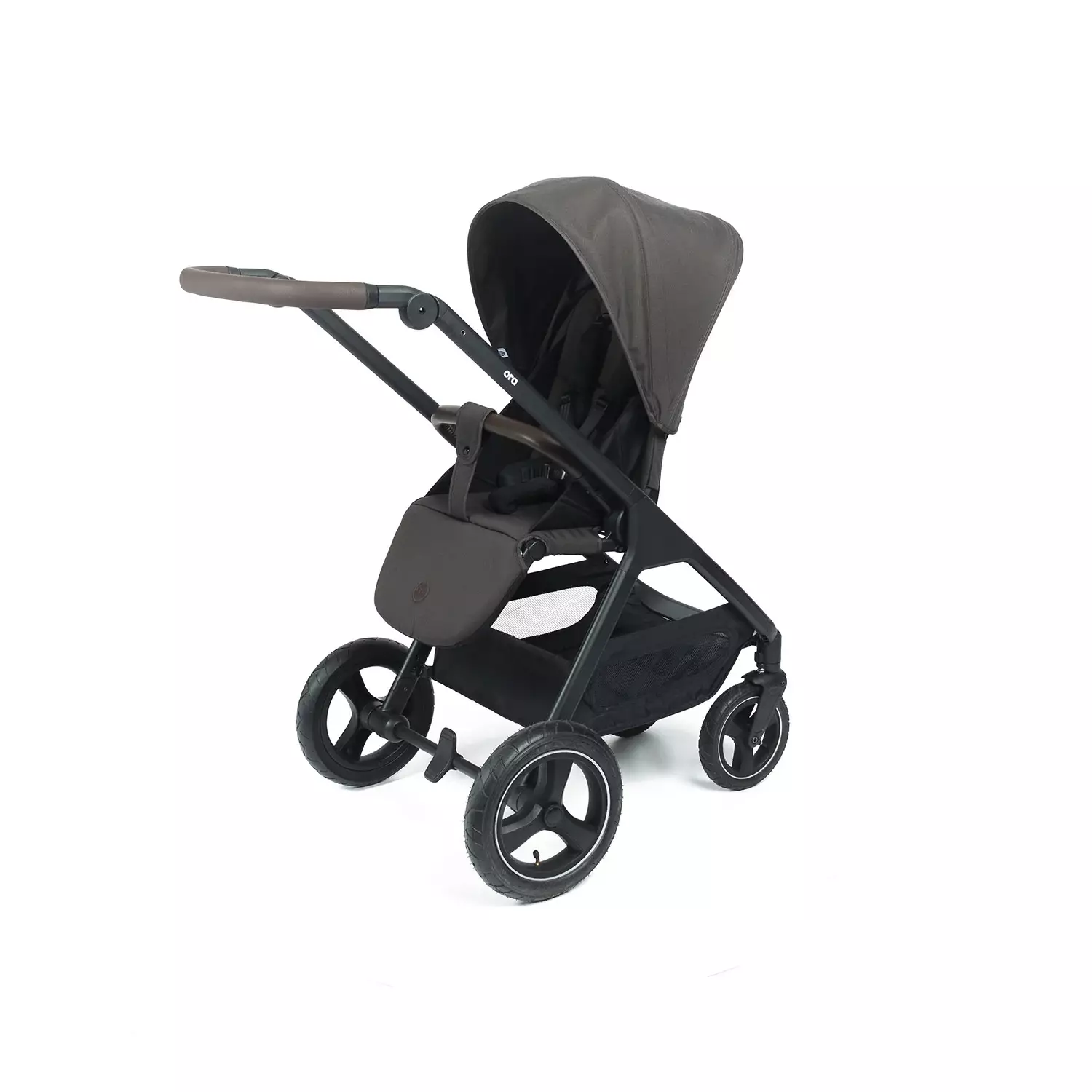 - Ramen är gjord av lätt och hållbart aluminium. Det svängbara handtaget erbjuder en bekväm höjd för personer i olika längder och är klätt med stiligt mörkbrunt eco-läder. Även längre föräldrar kan inte sparka bakaxeln med dessa vagnar. Båda sidor om ramen finns plats för en mugghållare.