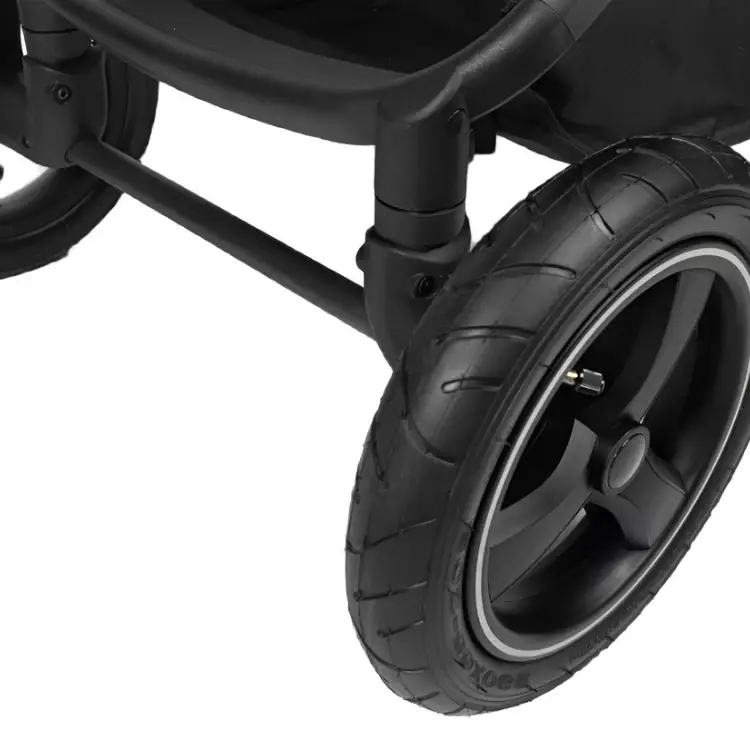 Hjulen har en egen framaxel som enkelt kan kopplas på de svängbara framhjulen. På så sätt får du fyra likadana hjul fastsatta i varje hörn av din Otso-kärra.