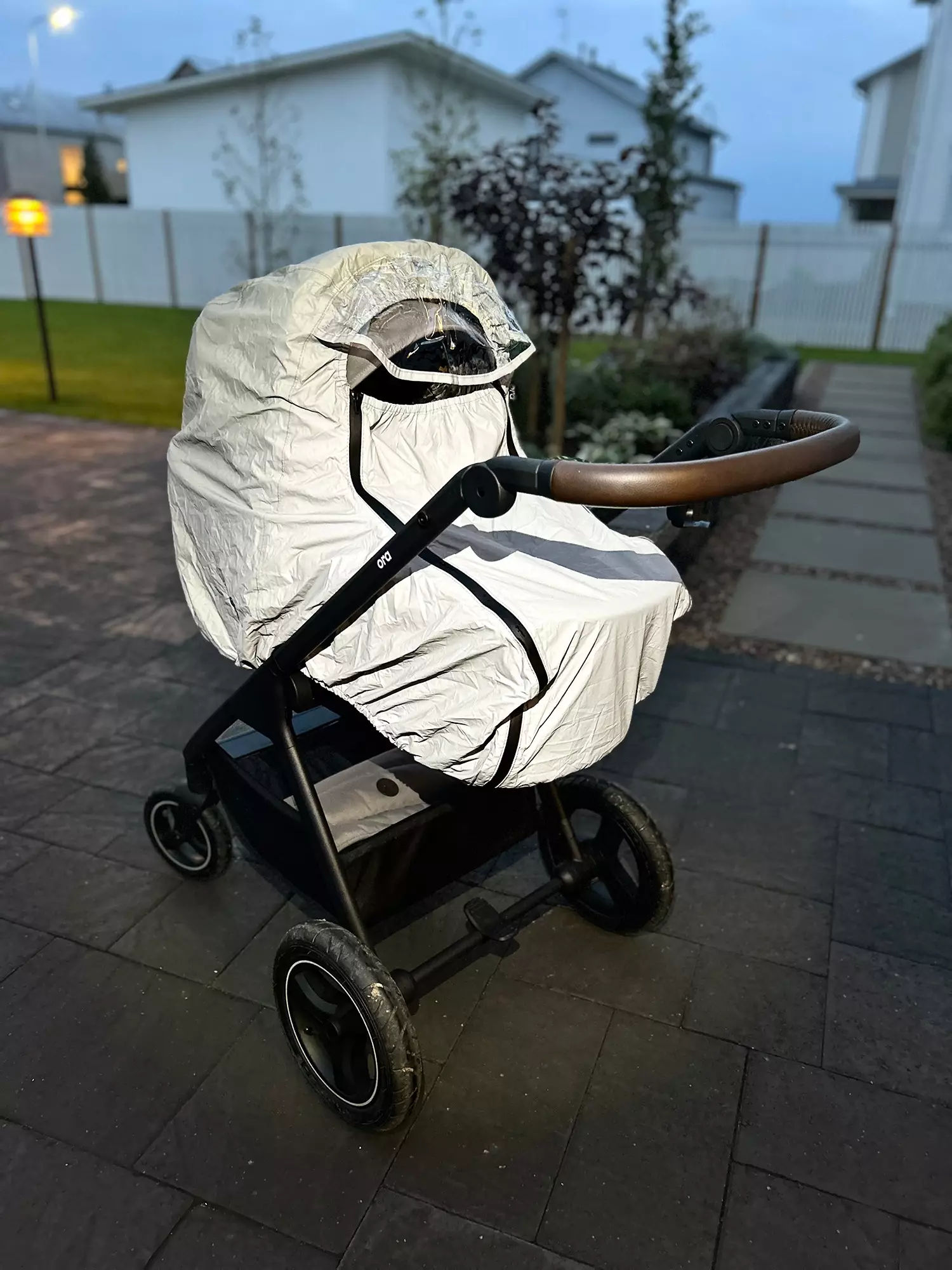 Regnskyddet har en universell design och passar alla Ora sulkies samt nästan alla andra barnvagnar och sulkies som finns på marknaden.