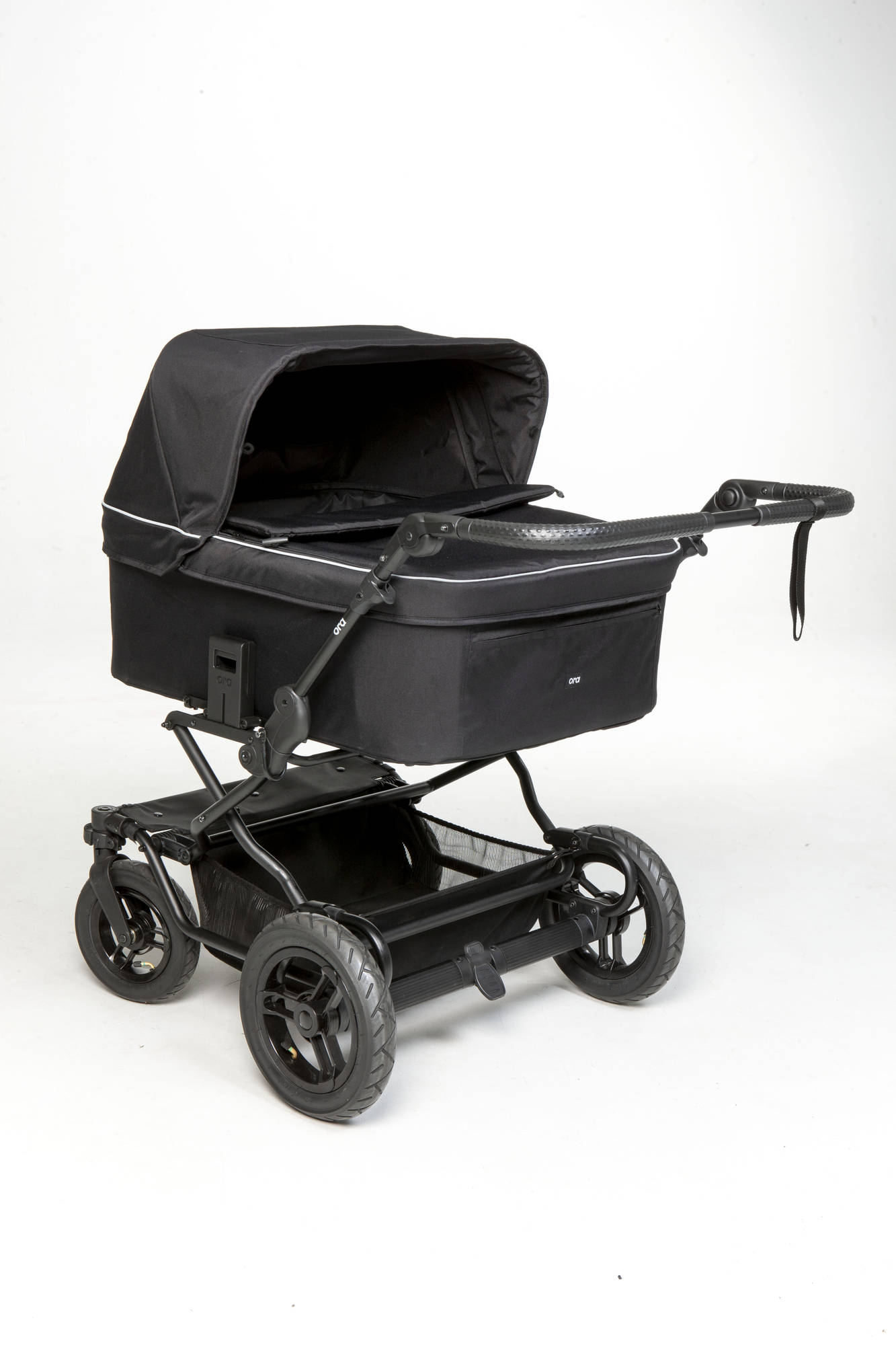 Ora Sisu liggkorg för tvillingar i svart passar till Ora Sisu tvillingvagnar. Liggkorgen är rymlig: tvillingar eller små trillingar får plats att sova säkert nära varandra.