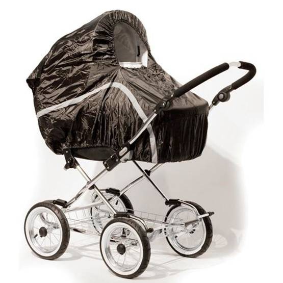 Svart regnskydd med dragkedja och reflexer. Passar de vanligaste vagn- och barnvagnsmodellerna.