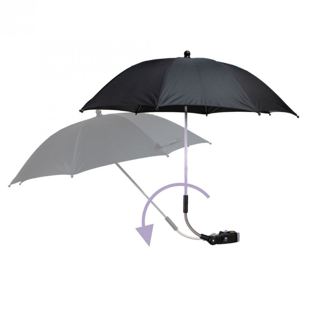 Det svarta solskyddet fästs enkelt på barnvagnens eller klädkärlets ram. Solskyddet kan enkelt justeras efter solen.