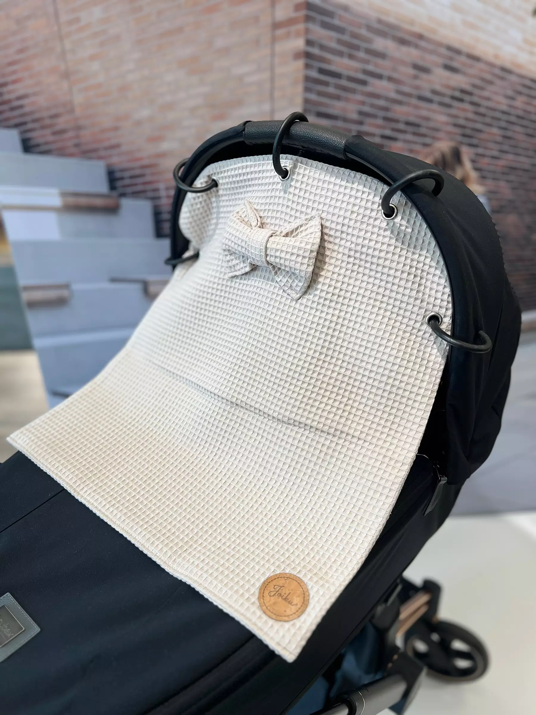 Barnvagnsöverdrag JoiKu Rosett Beige, våffeltyg - ett underbart lyxigt och mjukt barnvagnsöverdrag! Barnvagnsöverdraget är härligt fylligt eftersom det är av våffeltyg på båda sidor. Ett vackert detalj som pryder överdraget är en söt rosett.
