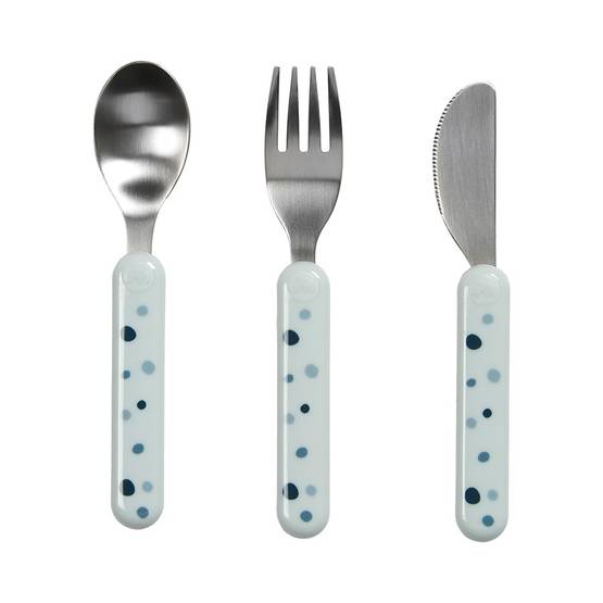 Bestick Done By Deer Dreamy Dots Blå är perfekta för små händer, dessa är utmärkta för att öva på att äta helt själv. Den breda gaffeln och skeden håller maten bättre på redskapet ända in i munnen. Kniven är ganska rundad, vilket gör den säker för barn att öva med.