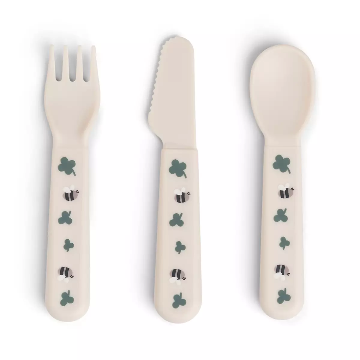 Besticksetet har mjuka, rundade kanter, vilket gör dem säkra för det övande barnet. Settet inkluderar en sked, gaffel och kniv. Besticken i sandfärg har bilder av klöver och bin.