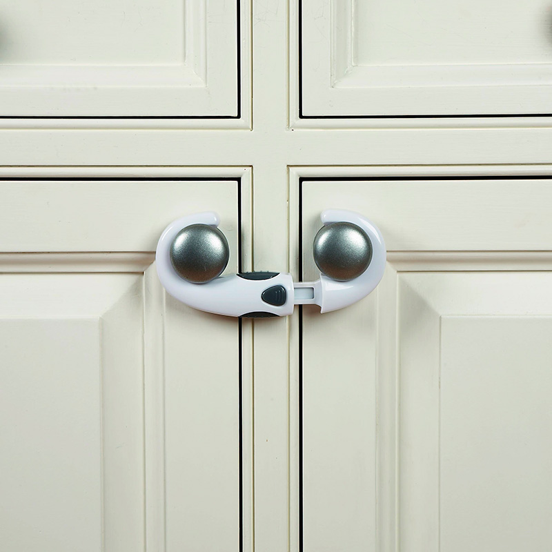 Clippasafe dubbel dörrstängare ny modell låser dubbel dörrar tätt ihop snabbt och enkelt. Dörrstängaren förhindrar barnet från att komma åt innehållet i skåpen. Stängaren fungerar både med dragknoppar och handtag.