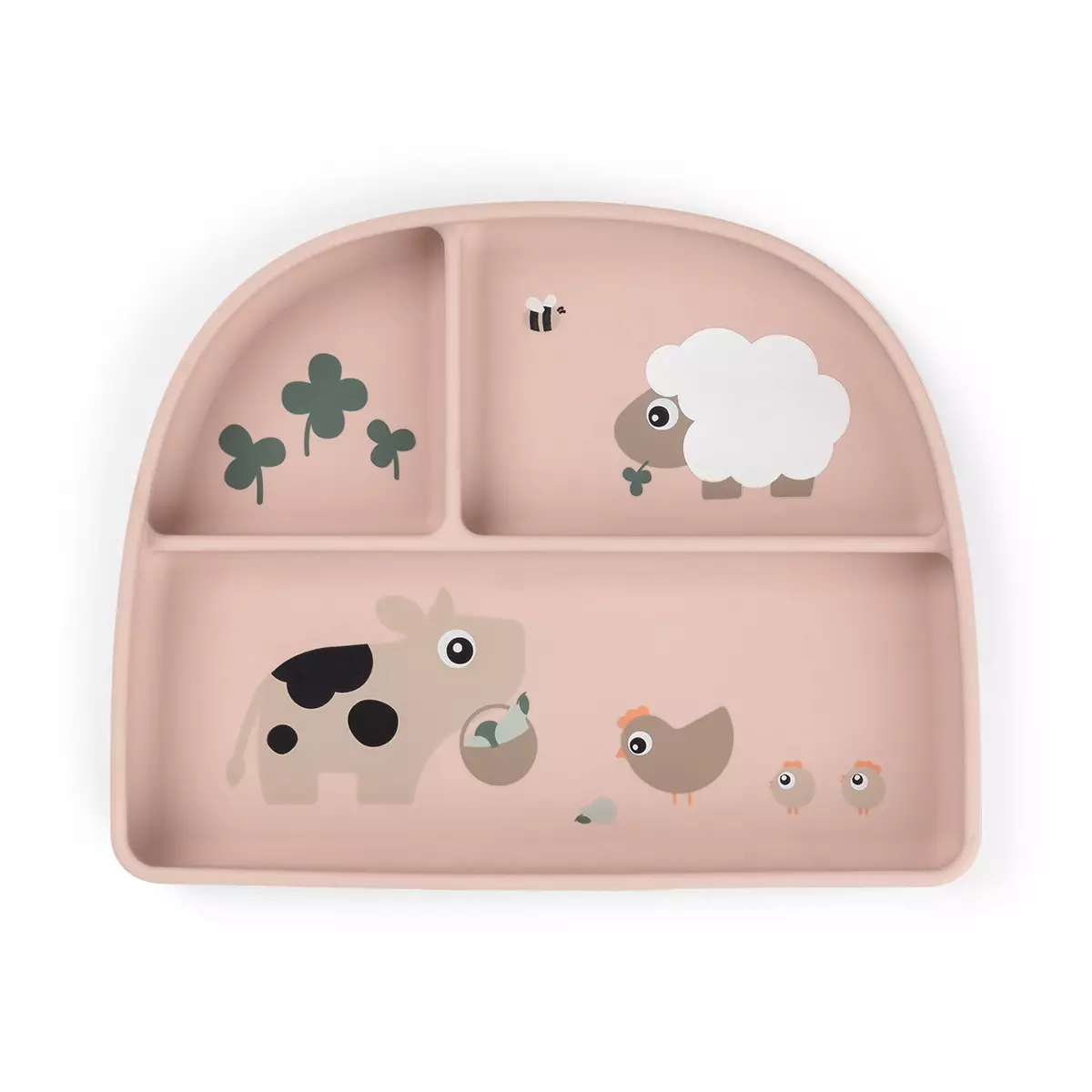 Delad tallrik Done By Deer Tiny Farm Powder är en söt tallrik för barnet. Den praktiska delade tallriken är rolig och användbar vid matstunder. Sugkoppen på tallrikens botten gör att måltiderna blir mycket smidigare för barnet. Tallriken är indelad i tre sektioner, perfekt för att dela upp olika maträtter som barnet kan smaka på. Den sandfärgade tallriken har en söt ko och ett får som sticker fram.