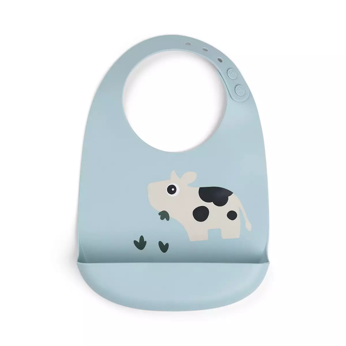 Ljusblå haklapp med en söt bild av Dotti-kossan.