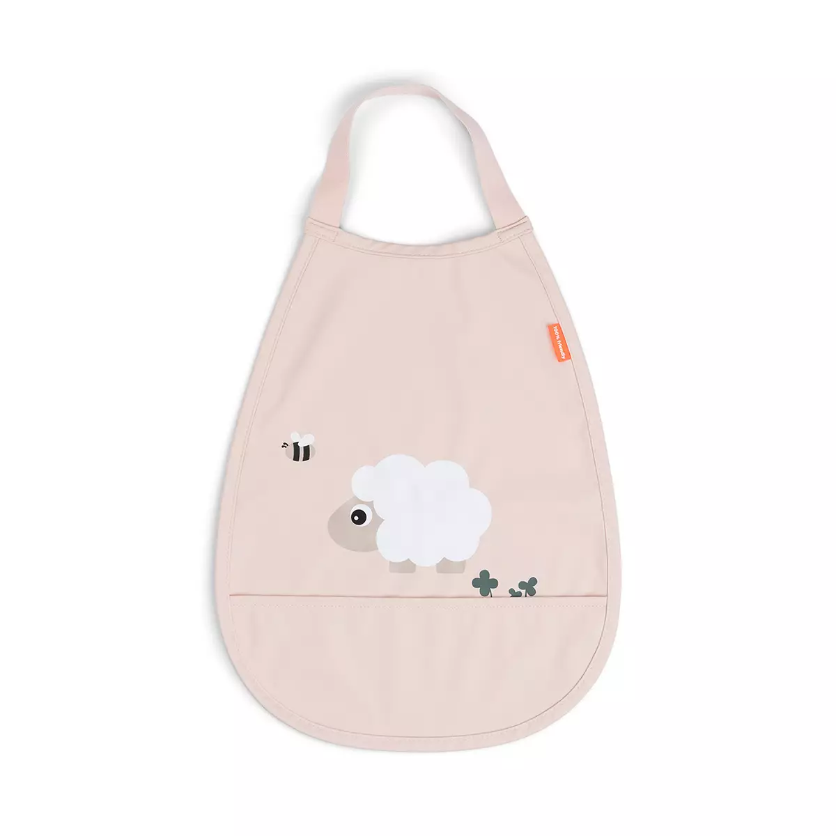 Done By Deer haklapp pull-over Tiny Farm Powder är en praktisk haklapp som gör måltidssituationen mindre stökig. Haklappen har en vattentät beläggning och är lätt att torka av eller tvätta i tvättmaskin. Haklappens ficka samlar upp mat som ramlar utanför. Med det flexibla nackbandet kan barnet enkelt sätta på och ta av haklappen själv - vilket uppmuntrar till ökad självständighet.