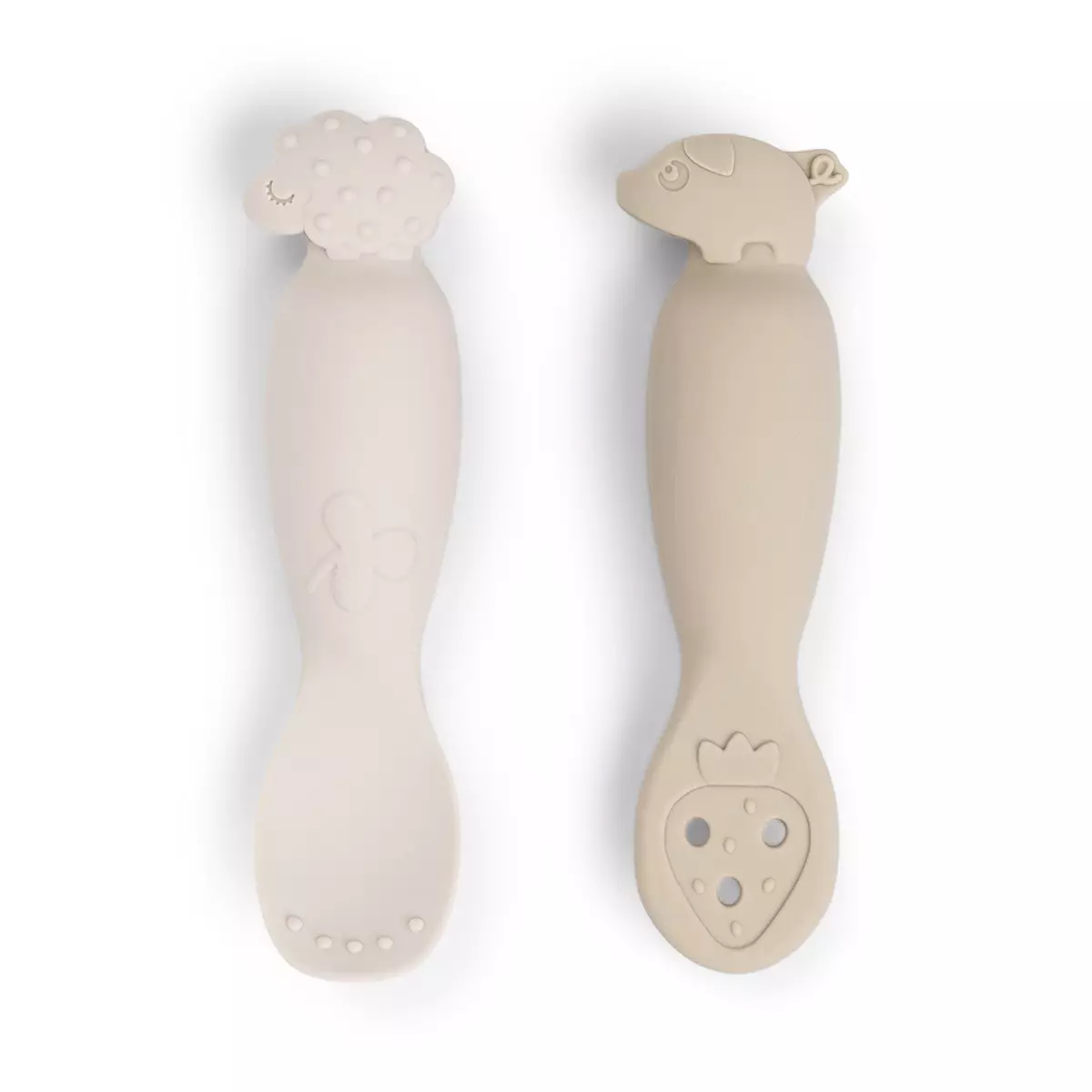 Done By Deer skedset Tiny Farm Sand är perfekt för små händer och passar utmärkt för att öva på att äta helt själv. Skedarna är tillverkade av 100% mjuk silikon, vilket gör dem särskilt bra som barnets första sked.