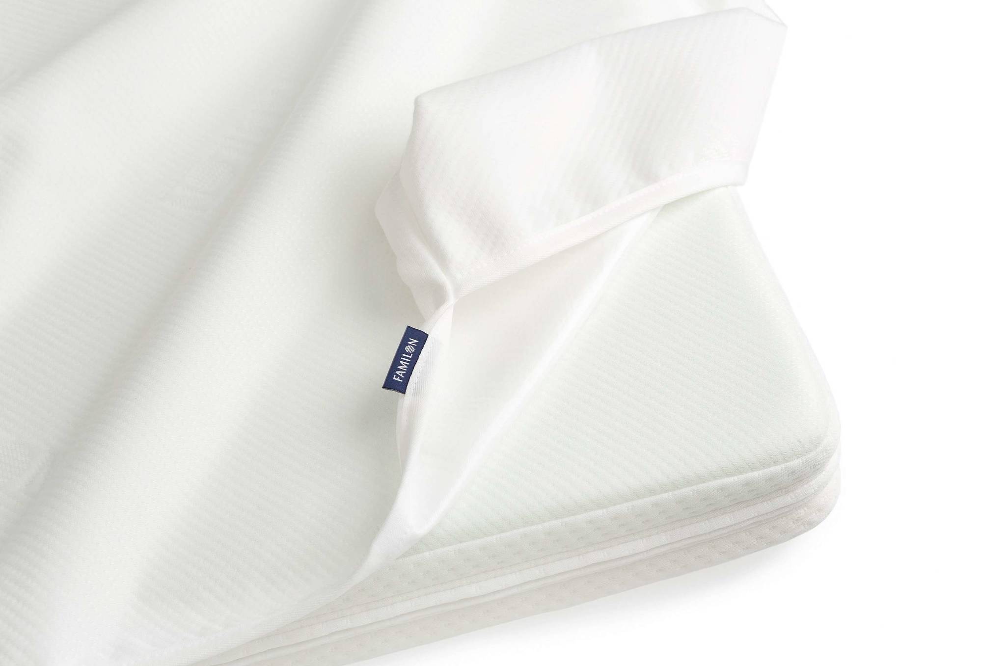 Familons madrasskydd sitter ordentligt på plats, då det har en fickformad söm i ena änden som träs över madrassen. Skyddet är längre än madrassen, vilket ger lite extra skydd och gör att det även passar en lite större bebis. Madrasskyddet är lätt att ta bort och torkar också snabbt efter tvätt. Du kan dock skaffa två skydd till din bebis, så att madrassen alltid är skyddad, även när det ena skyddet är i tvätt.