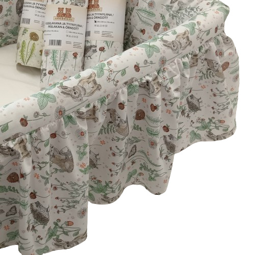 Föräldraskapsboxens kantkudde Anne & Mikael, Mansikkaniitty grön är en vacker kantkudde med en grönaktig bas och har kaniner, igelkottar och rävar mellan naturliga blommor. Kantkudden passar i storlek för föräldraskapsboxen och gör de hårda kanterna bekväma för barnet. Kantkudden dekorerar också föräldraskapsboxens kartong, vilket gör att barnets första säng ser särskilt fin ut.