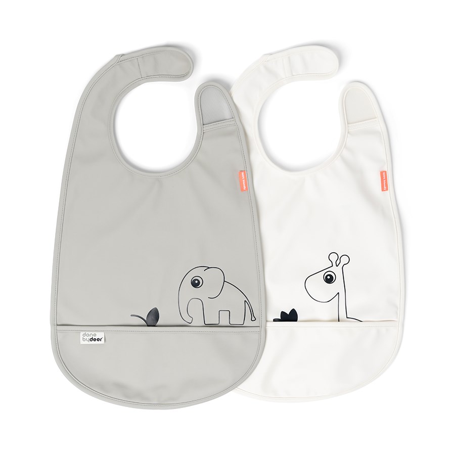 Matskydd Done By Deer 2-pack Deer Friends Grey/Beige är ett långt matskydd med ficka. Det långa matskyddet skyddar barnets och det mattränande barnets kläder väl, fickan samlar upp överflödigt mat. Produkten innehåller 2 stycken vackra matskydd, i färgerna grå och beige.