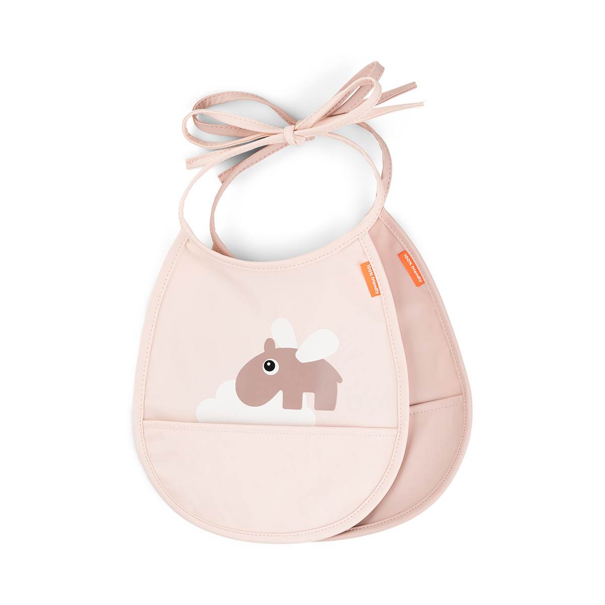 Matställ Done By Deer Tiny pocket bib 2-pack, Happy Clouds Powder är en vacker och praktisk matställ som skyddar barnets kläder. I förpackningen finns två matställ i mjuka rosa nyanser, en med Ozzo-karaktären och den andra med Croco.