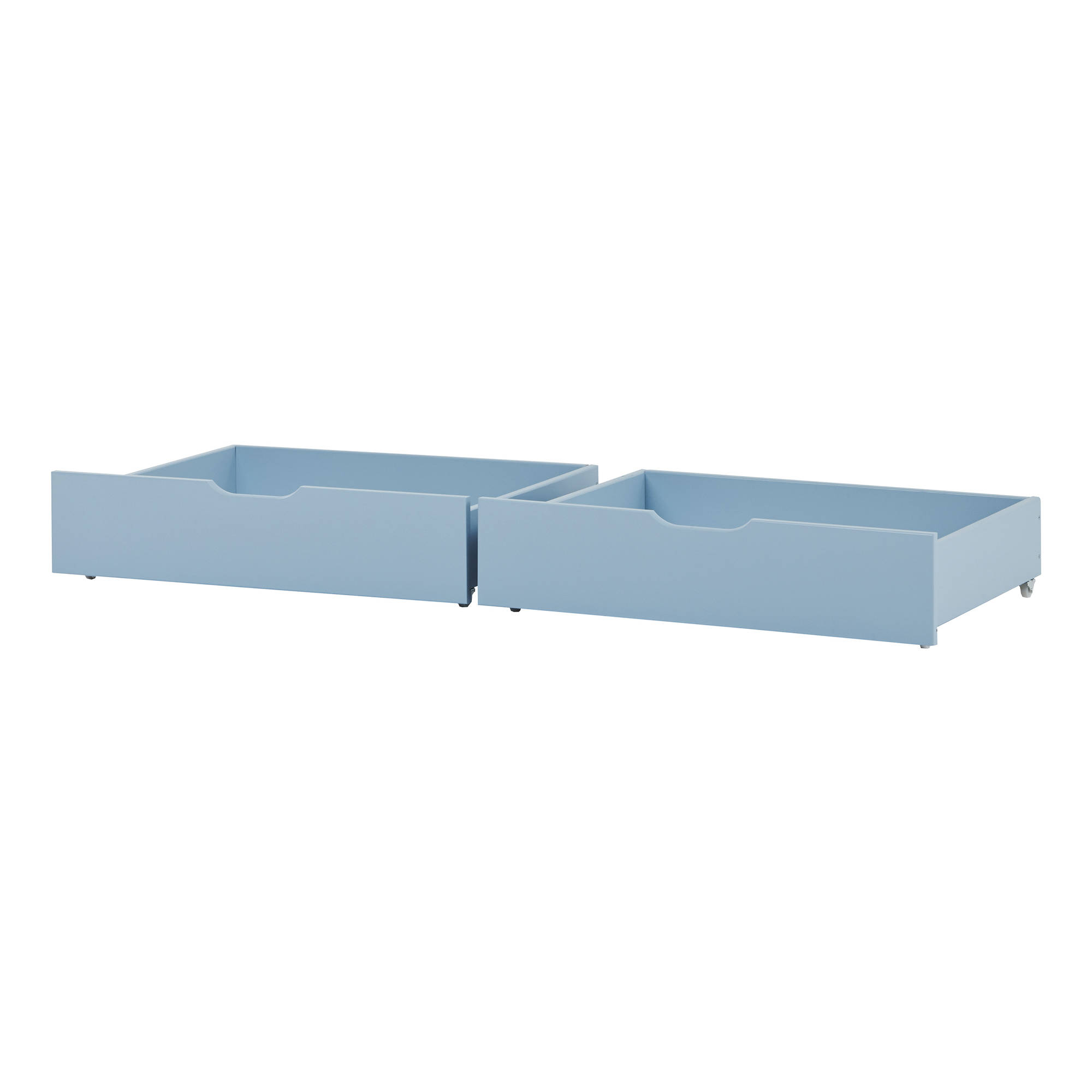 Lätt blå boxset med hjul i storlek 70x160 cm, som passar Hoppekids ECO Dream eller ECO Comfort sängar. Kan tvättas med en fuktig trasa och mild tvållösning.