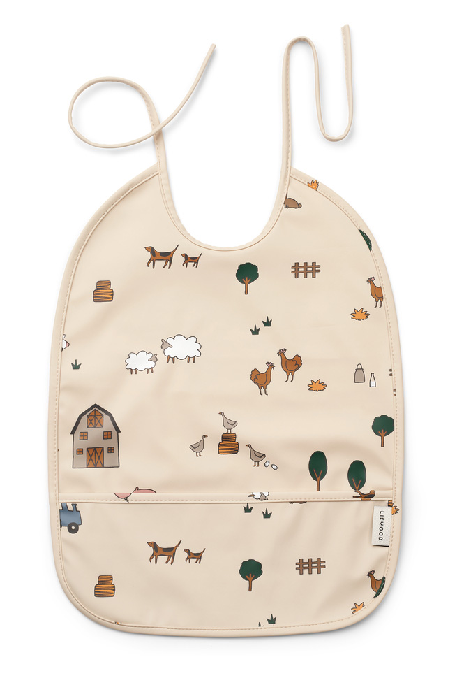 Liewood Lai haklapp Farm sandy är en vacker haklapp som skyddar barnets kläder. Haklappen är lätt att torka av och rengöra. Haklappens ficka fångar upp spilld mat.