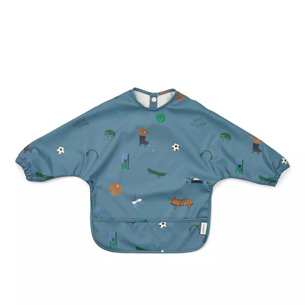 Liewood Merle haklapp med ärmar i färgen Fun/Beach blue är ett ärmklätt skydd som även kan användas när barnet målar eller gör andra kladdiga aktiviteter. Skyddar effektivt ärmarna samt barnets kläder. Mycket praktisk vid självständigt ätande. Enkel och snabb att rengöra - skölj av och torka ren! Förklädet har en ficka framtill. Den blå haklappen har en lekfull illustration.
