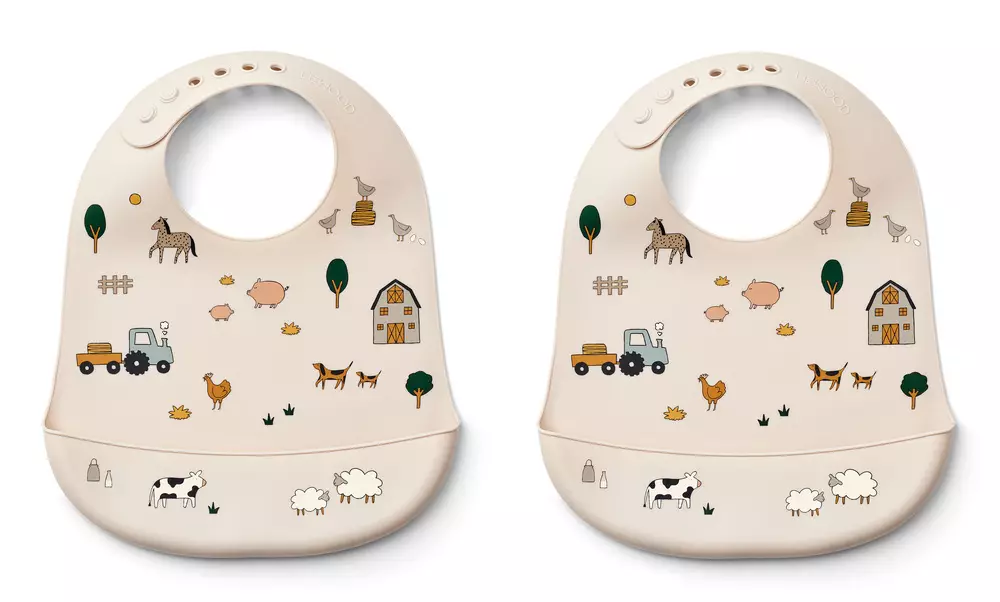 Liewood Tilda haklapp 2-pack Farm sandy är en vacker och praktisk haklapp som fångar upp alla smulor som hamnar på golvet. Det finns två likadana haklappar och de är tillverkade av lättstädad silikon.