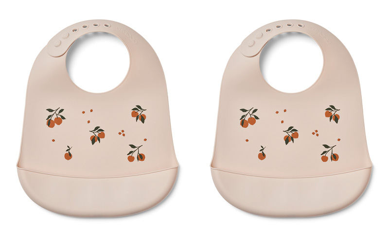 Förpackningen innehåller två haklappar med läckra persikobilder. Justerbart silikonband bak vid nacken.