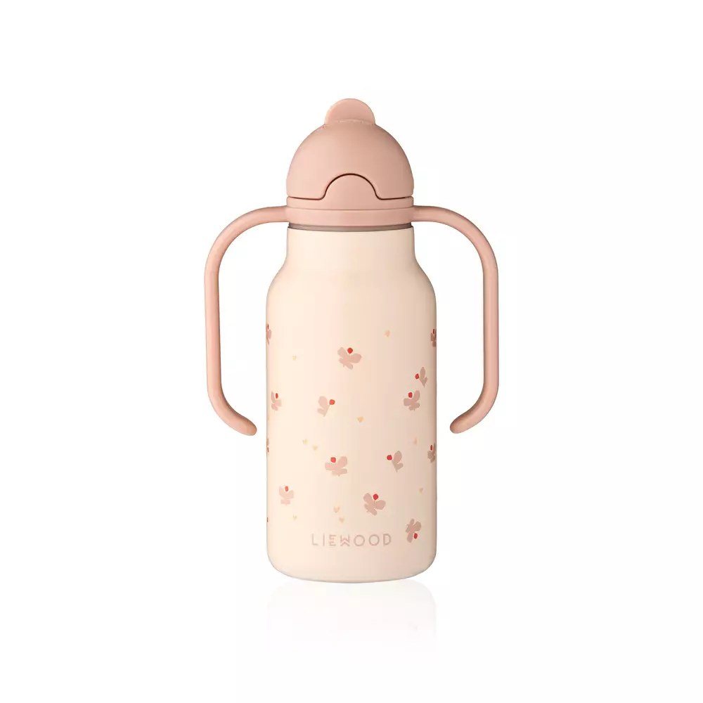 Liewood vattenflaska Kimmie 250 ml Mini butterfly/Apple blossom är en rostfri termosflaska med handtag, som håller drycken varm eller kall. En mycket praktisk termosflaska för hemmet, förskolan eller utflykter. Flaskan har handtag som är fästa på locket. Flaskan har en vikbar sugdel. Vattenflaskans lock är kompatibelt med alla Falk-flaskor.