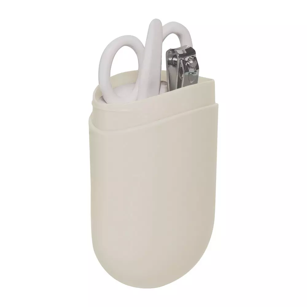 Kompakt förvaringslåda med nagelfil, klippare och rundade saxar.