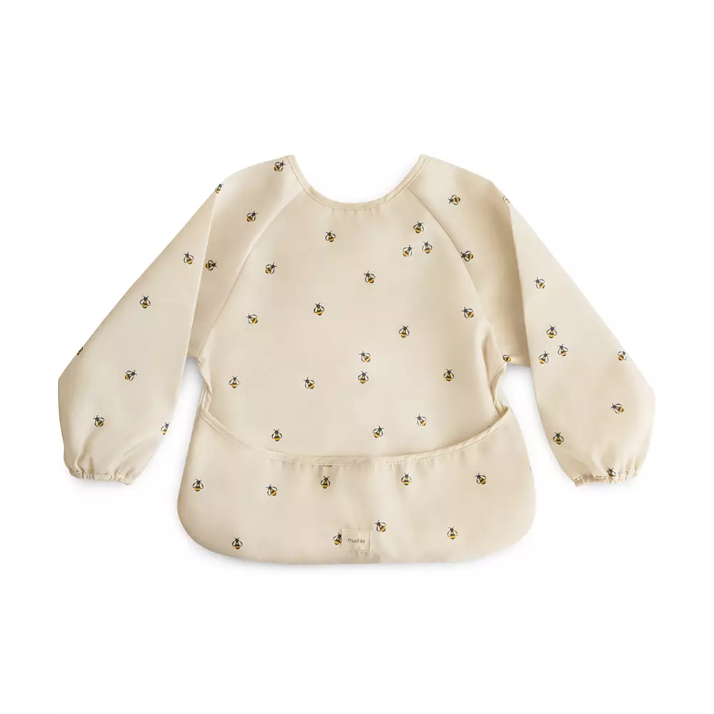 Mushie Bees duk med ärmar skyddar barnets kläder under måltider, pyssel och andra kladdiga aktiviteter. Dess breda ficka samlar upp överskottsmat och hålls på plats tack vare kardborrefästet. Skölj av och häng för att torka eller lägg i tvättmaskinen!