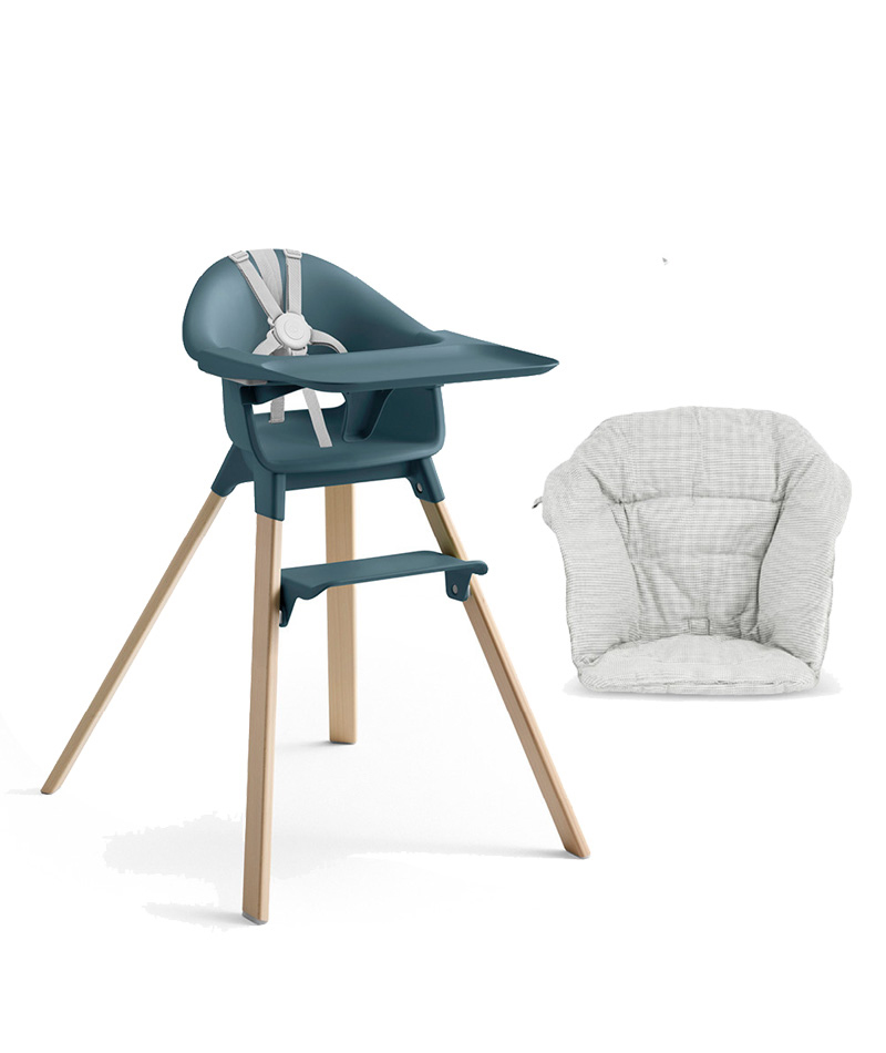 Matstol Stokke Clikk & dyna i Fjord Blue-paketet innehåller en Fjord Blue färgad Stokke Clikk matstol samt en dyna i färgen Nordic Grey.