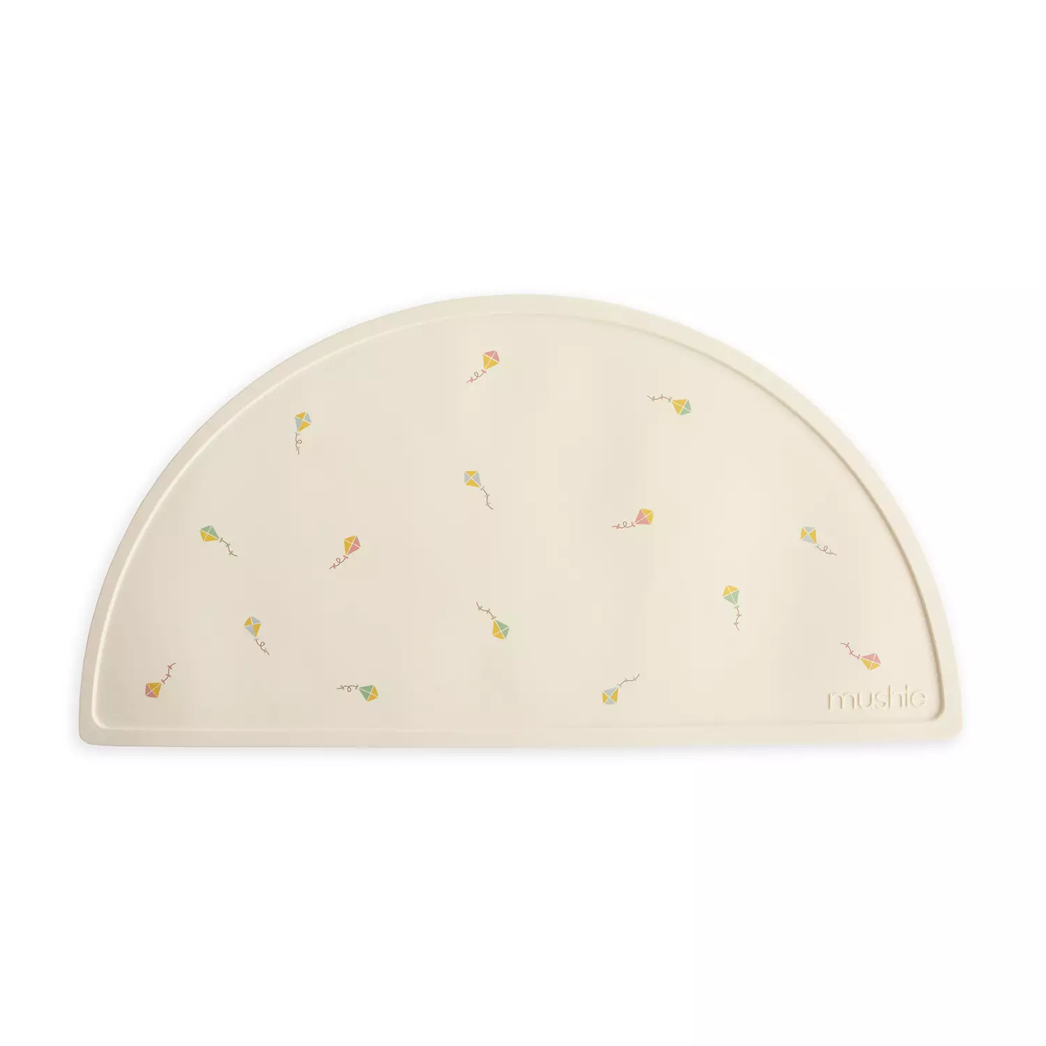 Mushie Kites silikonmatta är en rolig matta för måltider med bilder av drakar. Mattan ligger stabilt på bordet och tallrikarna hålls på plats tack vare den halkfria silikonytan. Inga fler flygande tallrikar!