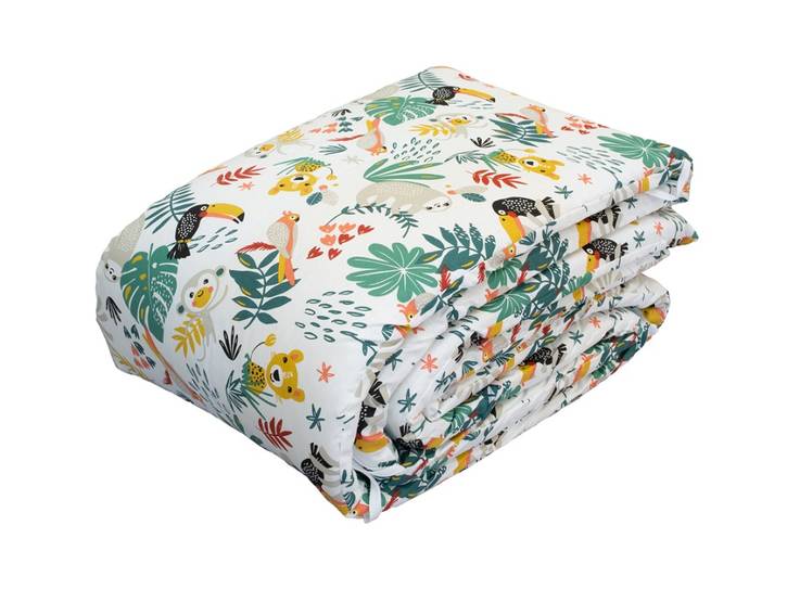 Spjälsängens sargar Anne & Mikael Tropiikki är en färgglad kudde med tropiska djur som gör spjälsängen säkrare för din baby. Sargarna skyddar spjälsängens hårda kanter så att barnet inte skadar sig på kanterna eller får fötterna mellan spjälorna.