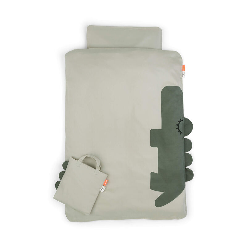 Sängklädeset Done By Deer organic Croco Green 100x140 innehåller underbart mjuka, bomullssängkläder och örngott. De vackra, färgglada linnekläderna har den sovande Croco-figuren som detalj.