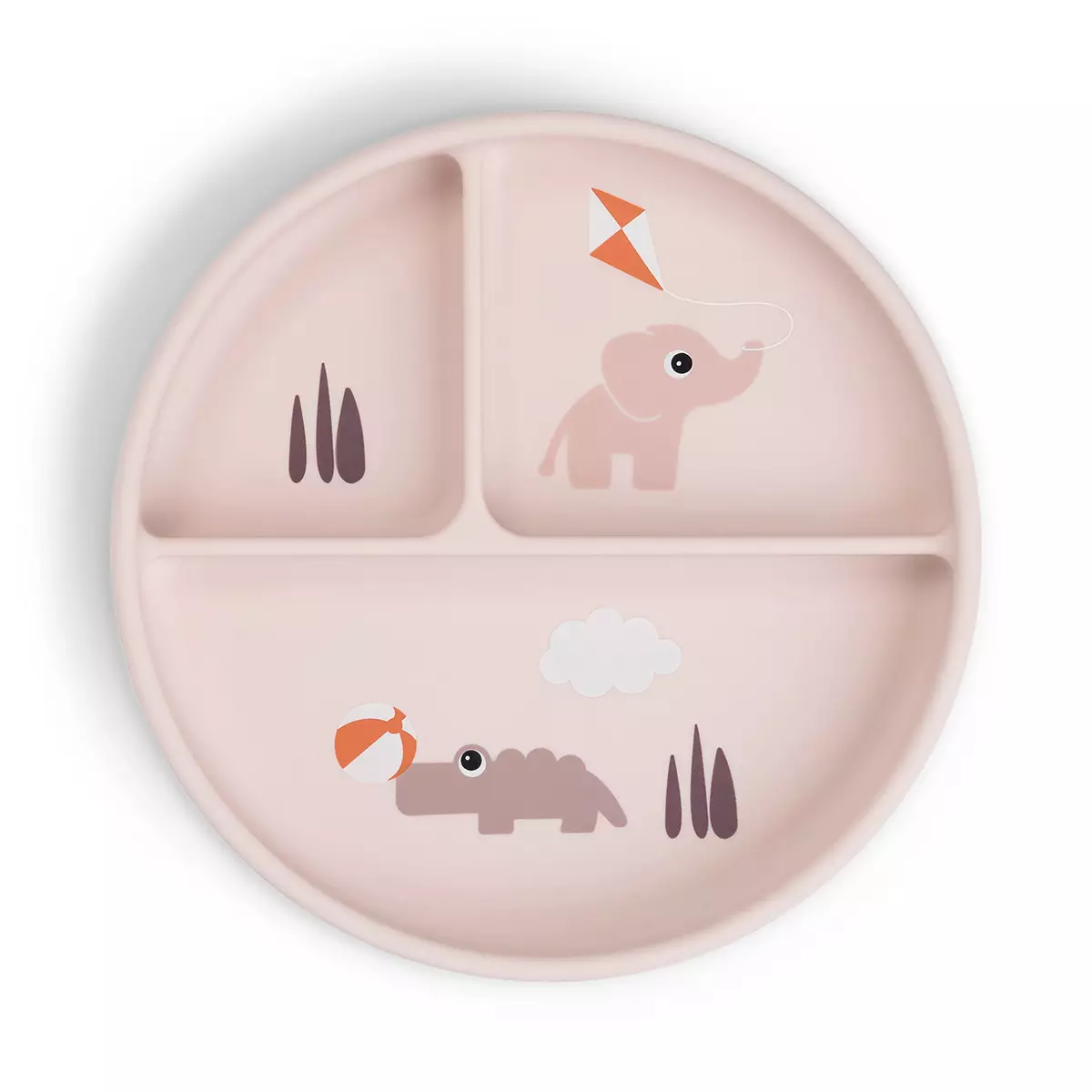 Silikontallriken med sugkopp Done By Deer Playground är en söt tallrik för barn. Den praktiska facktallriken gör måltiden roligare för barnet. Tallriken är indelad i tre sektioner där du kan dela upp olika maträtter till barnet att smaka på. Från den rosa tallrikens botten tittar söta djurvänner fram: en elefant och en krokodil.