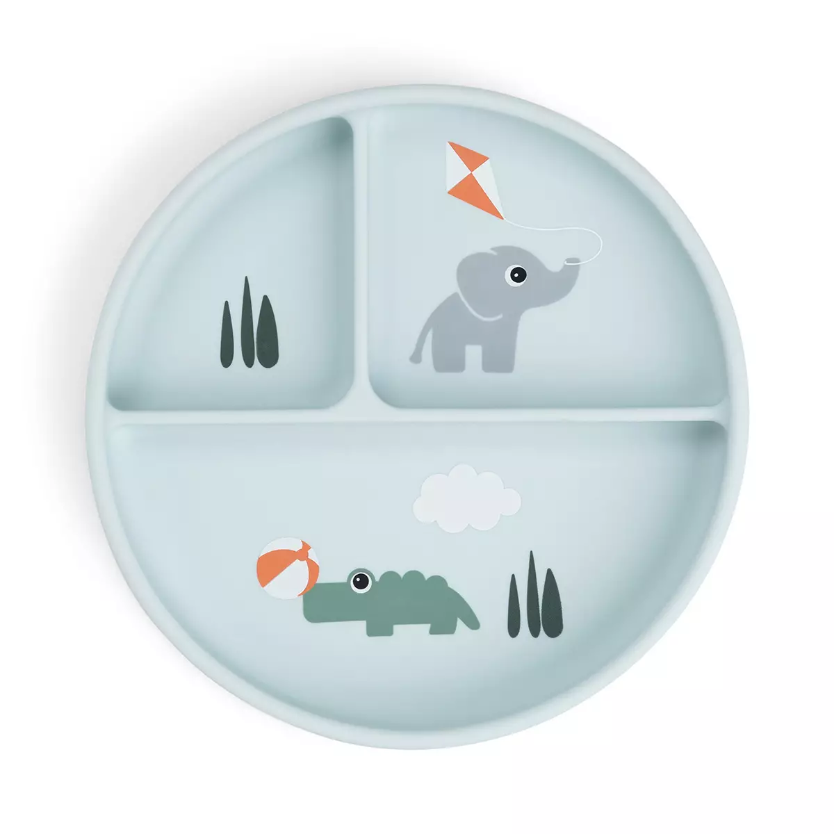 Silikontallriken med sugkoppar Done By Deer Playground är en söt tallrik för barnet. Den silikonbaserade facktallriken är praktisk och rolig för barnets måltider. Tallriken är indelad i tre sektioner där du kan dela upp olika maträtter för barnet att smaka på. Från den ljusblå tallrikens botten sticker de söta djurvännerna elefanten och krokodilen fram.