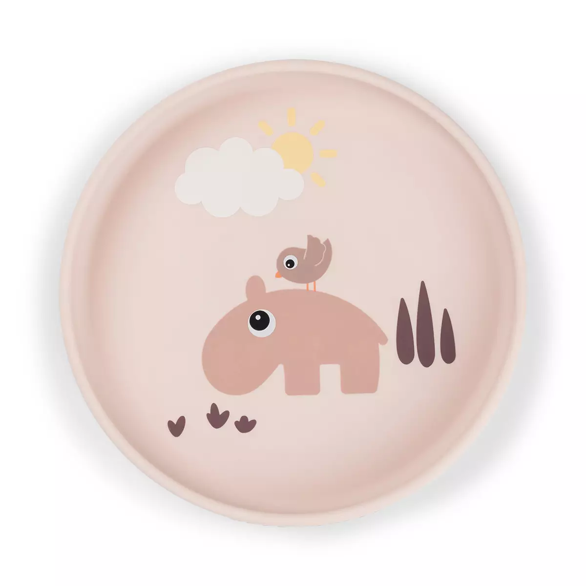 En ljus puderfärgad silikontallrik från Done By Deer för barn med sugkopp i botten är ett praktiskt val för barnets måltider.