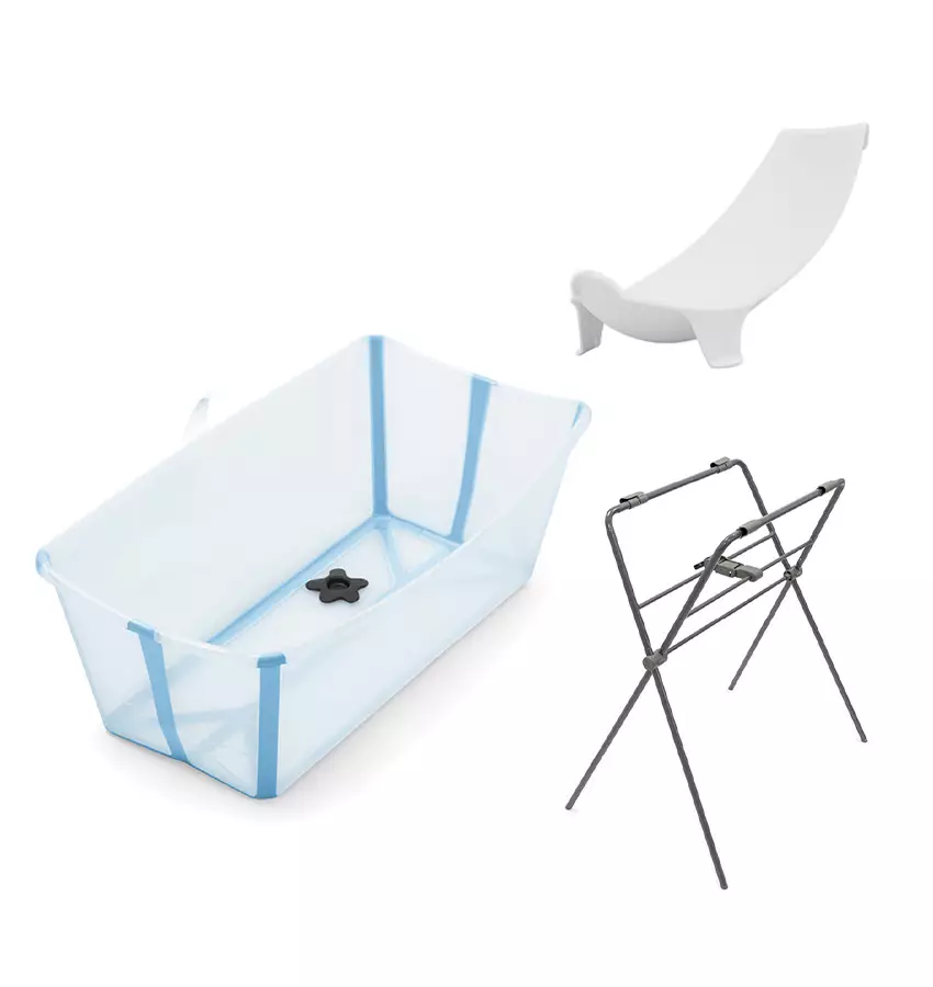 - Flexi Bath Stand, en badkarshållare, som lyfter upp barnets badkar till en ergonomisk höjd och sparar din rygg från belastning. Badkaret töms via avloppsslang. Badkarshållaren fälls ihop med badkaret, så du behöver inte alltid plocka isär dem.