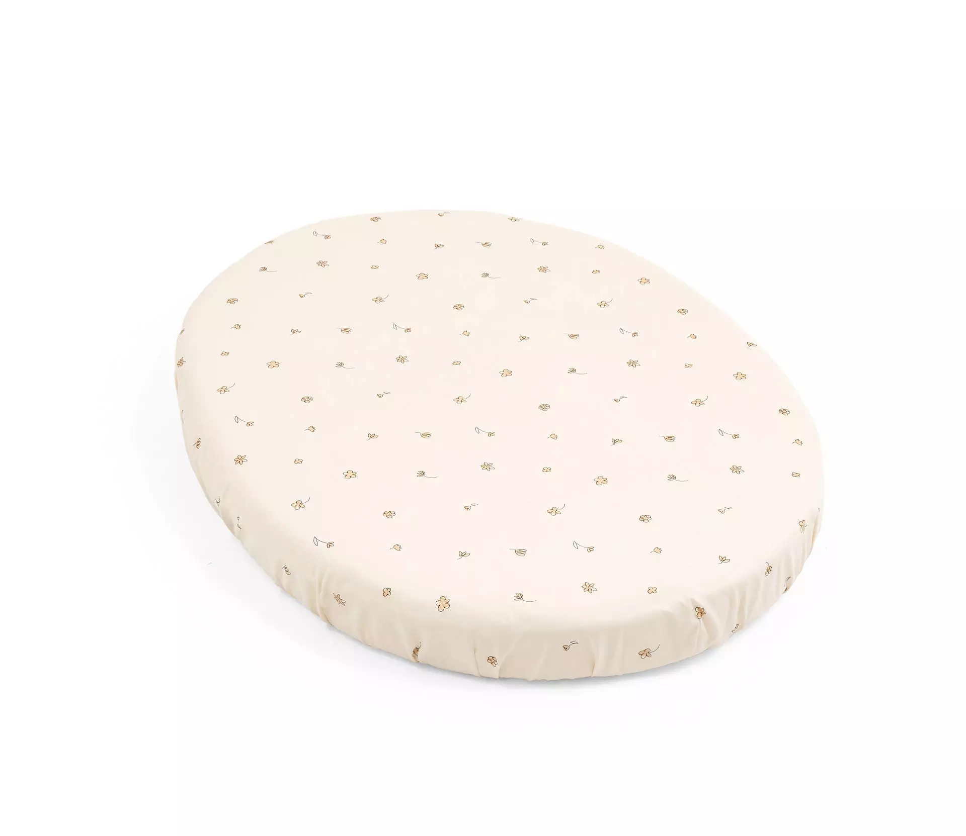 Stokke formad lakan Sleepi Mini V3 Flower Ecru OCS - NYHET, ett underlakan som passar perfekt runt en oval madrass.