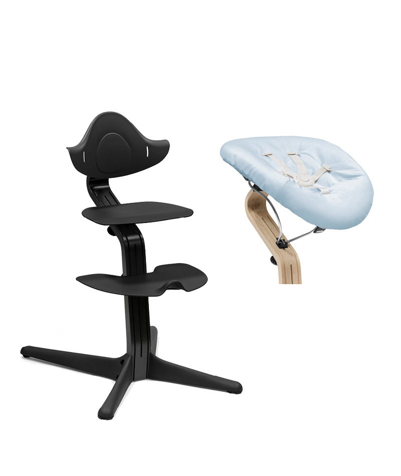 Stokke Nomi Chair stol & Newborn set Black/Black och Grey/Blue innehåller Stokke Nomi barnstol i färgen Black/Black och Baby Set i färgen Grey/Blue.