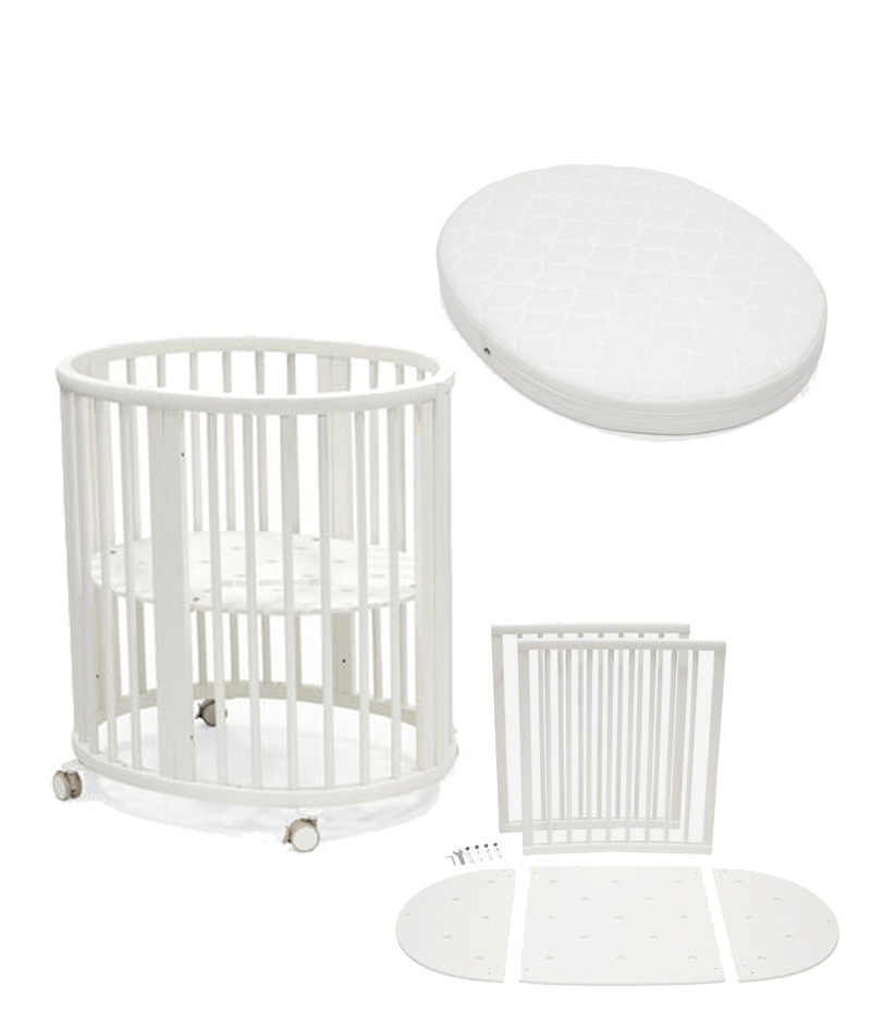 Stokke Sleepi Mini startpaket 3 in 1 White V3 innehåller Stokken Sleepi Mini V3 spjälsäng, madrass samt Extension tilläggsdelar för att växa sängen. Vacker oval spjälsäng för barnkammaren. Sängen är lätt att flytta utan problem från plats till plats med hjälp av hjulen.