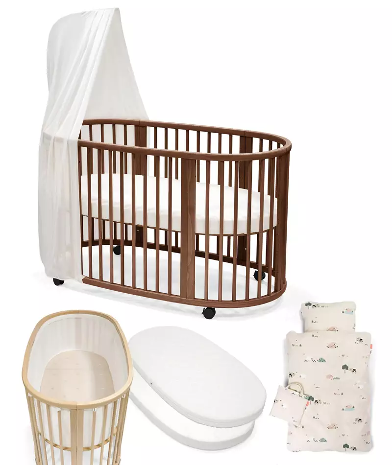 Stokke Sleepi V3 startpaket 8 in 1 Warm Brown innehåller Stokke Sleepi V3 spjälsäng med tillbehör. En vacker och inbjudande spjälsäng till barnrummet.