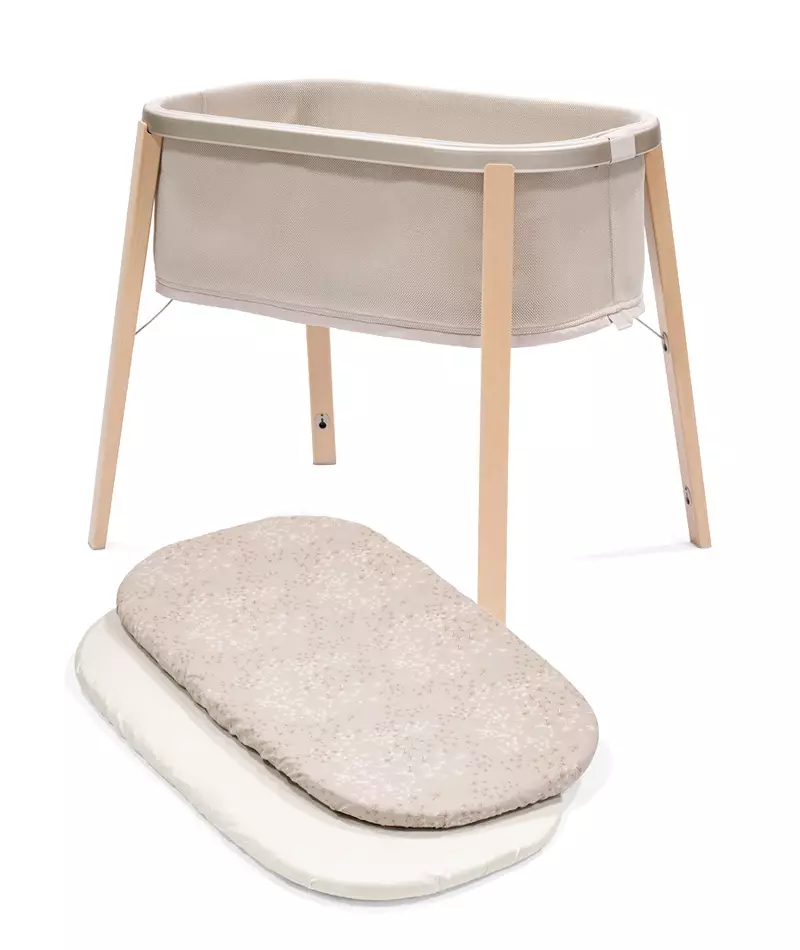 Stokke Snoozi säng Sandy Beige och formsydda sängkläder 2-pack i samma förpackning. Stokke Snoozi säng är den perfekta sängen för din lilla. Snoozi är en ny version av babysängen som är luftig och lätt, mjuk och oval i formen. Stokke Snoozi är barnets första säng, som är lämplig från födseln. Den har en fast och bekväm madrass och de andningsbara tygerna gör den till en säker plats för nyfödda att sova.
