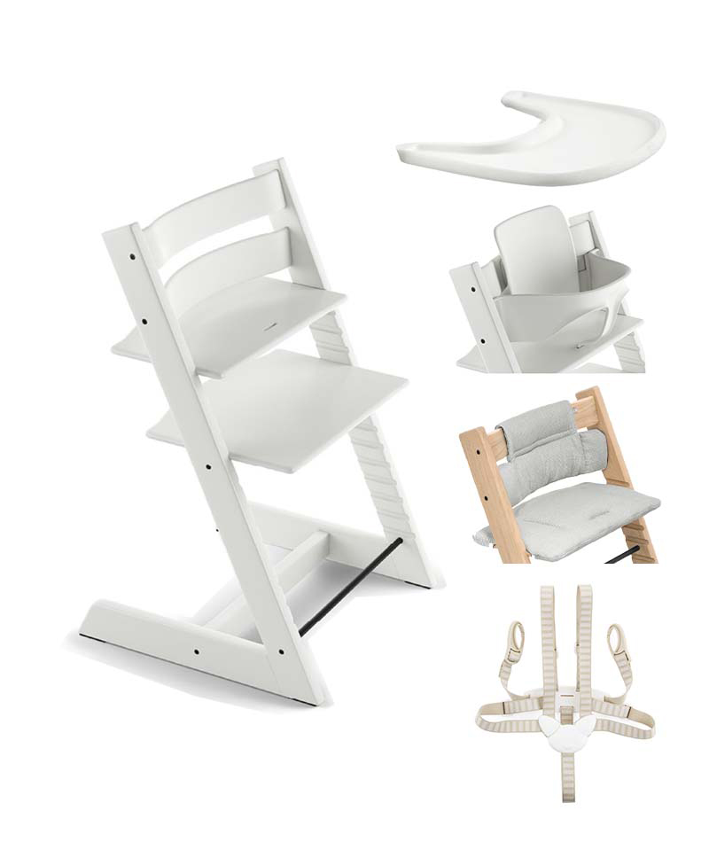 Tripp Trapp startpaket Stokke 5 i 1 White innehåller Stokke Tripp Trapp barnstol, Baby Set och bricka, alla i färgen White samt bälte och sittdyna i färgen Nordic Grey.