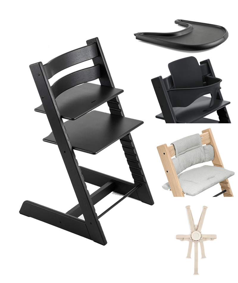 Tripp Trapp startpaket Stokke 5 in 1 Ek svart innehåller Stokkens Tripp Trapp barnstol, svart Baby Set och bricka samt sele och sitsdyna.