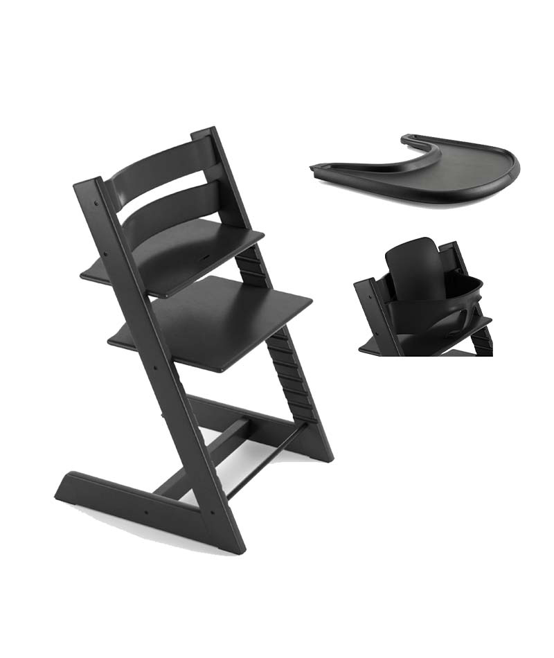 Tripp Trapp startpaket Stokke Black innehåller Stokkes Tripp Trapp matstol, Baby Set och bricka i färgen Black.