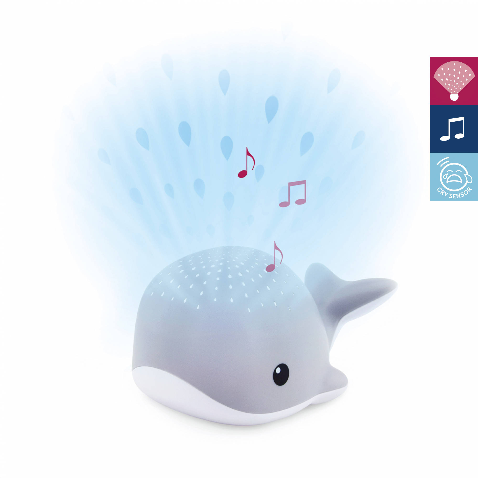 Zazu Wally godnattsångsbox och projektor Grey är en lugnande vän i nattens mörker. Spelkassan spelar tre olika melodier och projektorn projicerar ett vattendroppsmönster på taket.