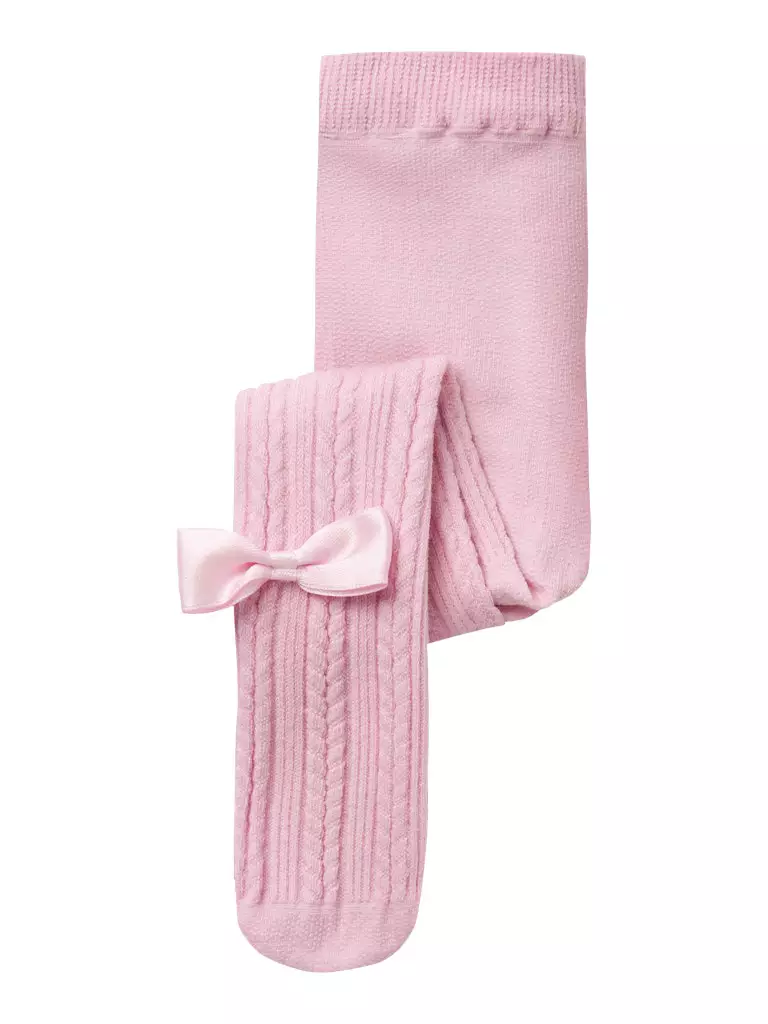 Festliga babystrumpbyxor med flätat mönster. Rosa strumpbyxor prydda med rosetter vid anklarna.