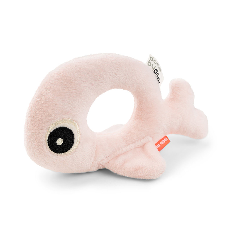 Rangla Done By Deer ringrangle Wally Powder är en söt rangle för bebisar. Wally-valen är underbart mjuk och ranglen har en tjock ring som är lätt för barnet att greppa. Wally underhåller bebisen hemma, i barnvagnen och på bilresan. Valens fenor prasslar och leksaken ringer glatt när barnet viftar med den. Tack vare fenorna står ranglen också upprätt på egen hand.
