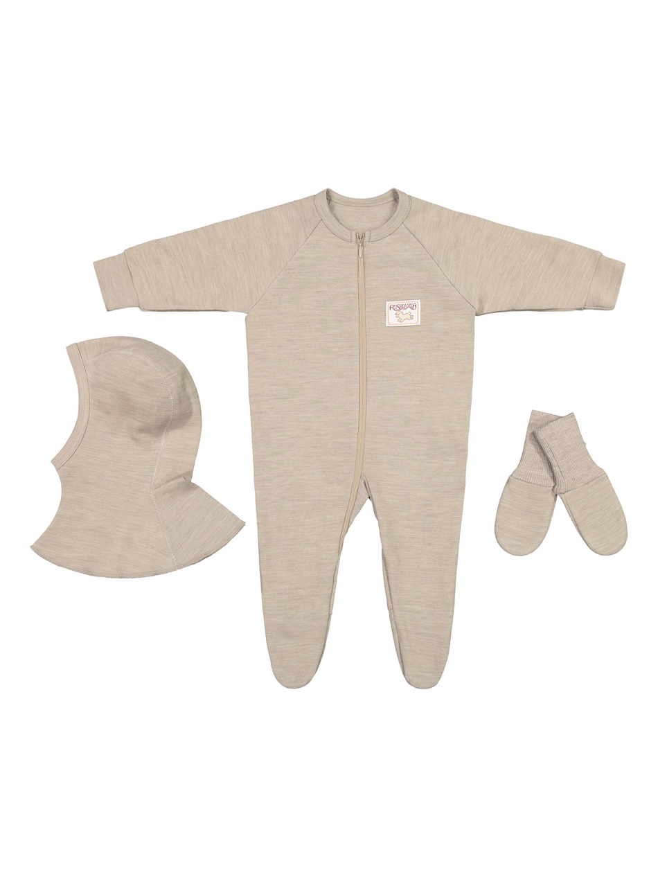 Ruskovilla baby utomhusset Hiekka Merinoull, Ruskovilla 40-års jubileumsprodukt är ett babyset i ull som innehåller en ulloverall, en mössa och vantar.